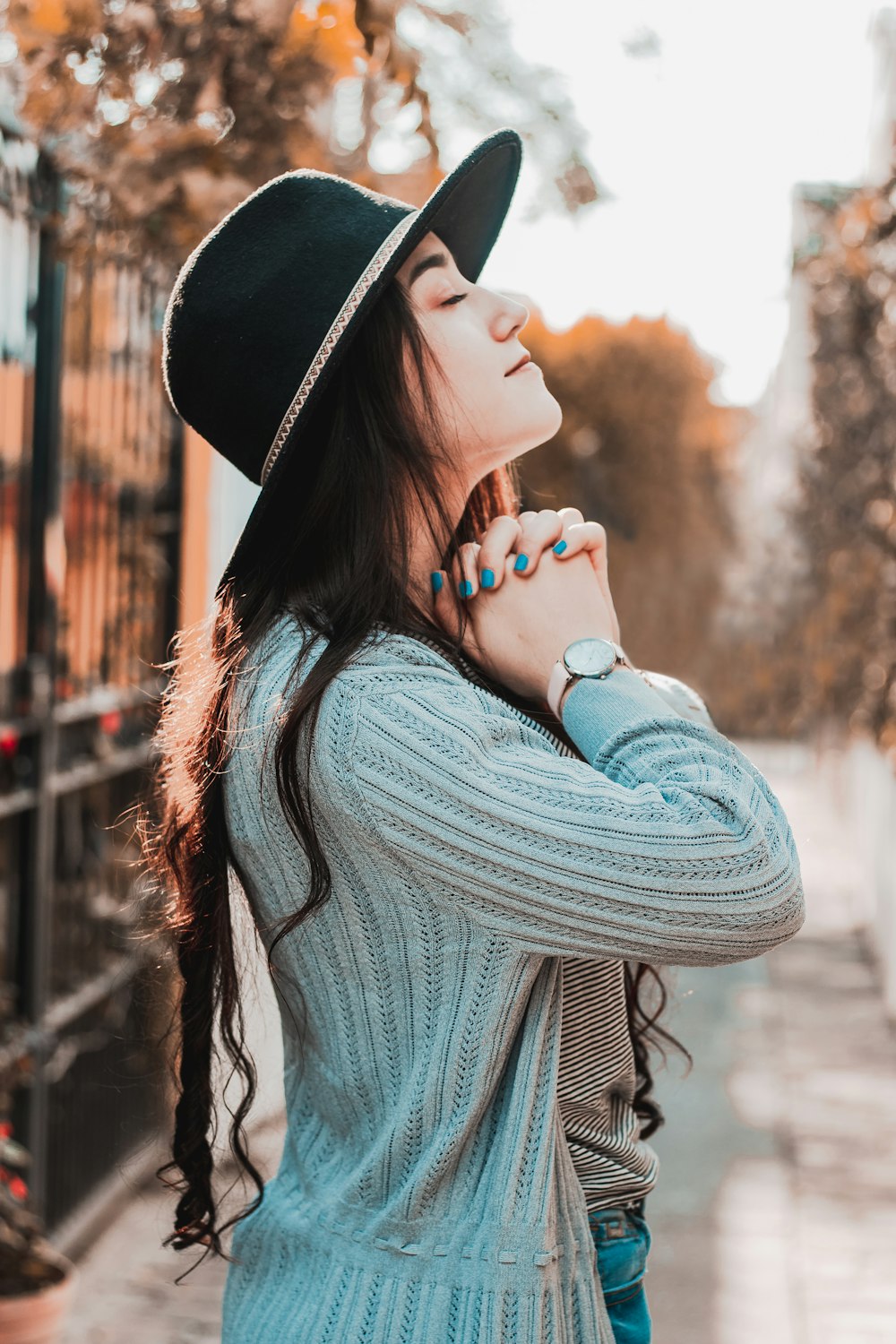 woman in black hat and gray sweater